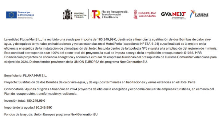 FLUIXA MAR, S.L. ha obtenido de la Unión Europea a través del Fondo Europeo de Recuperación Next Generation EU, en el marco del Plan de Recuperación, Transformación y Resiliencia, promovido por el Ministerio para la Transición Ecológica y el Reto Demográfico la subvención para instalaciones de autoconsumo: PROGRAMA 1 IDAE. AUTOCONSUMO SECTORES SERVICIOS por Importe de la ayuda de 19.589,36 euros para una potencia de 50 KW en HOTEL PERLA BENIDORM, Real Decreto 477/2021y expediente IDAUT1/2021/1880.